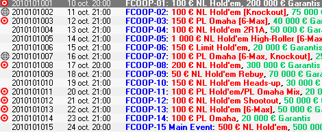 Ça commence donc le 10 octobre et ça se termine le 24. Pour ma part, j’essayerai de participer aux event 1, 14 et 15. Au total c’est un prizepool de 1,5 millions d’euros qui est garanti lors de ces FCOOP, impressionnant mais très loin des 40m$ de la version .com (qui devrait d’ailleurs compter avec les joueurs français en moins et donc un prizepool moins important, et toc!).